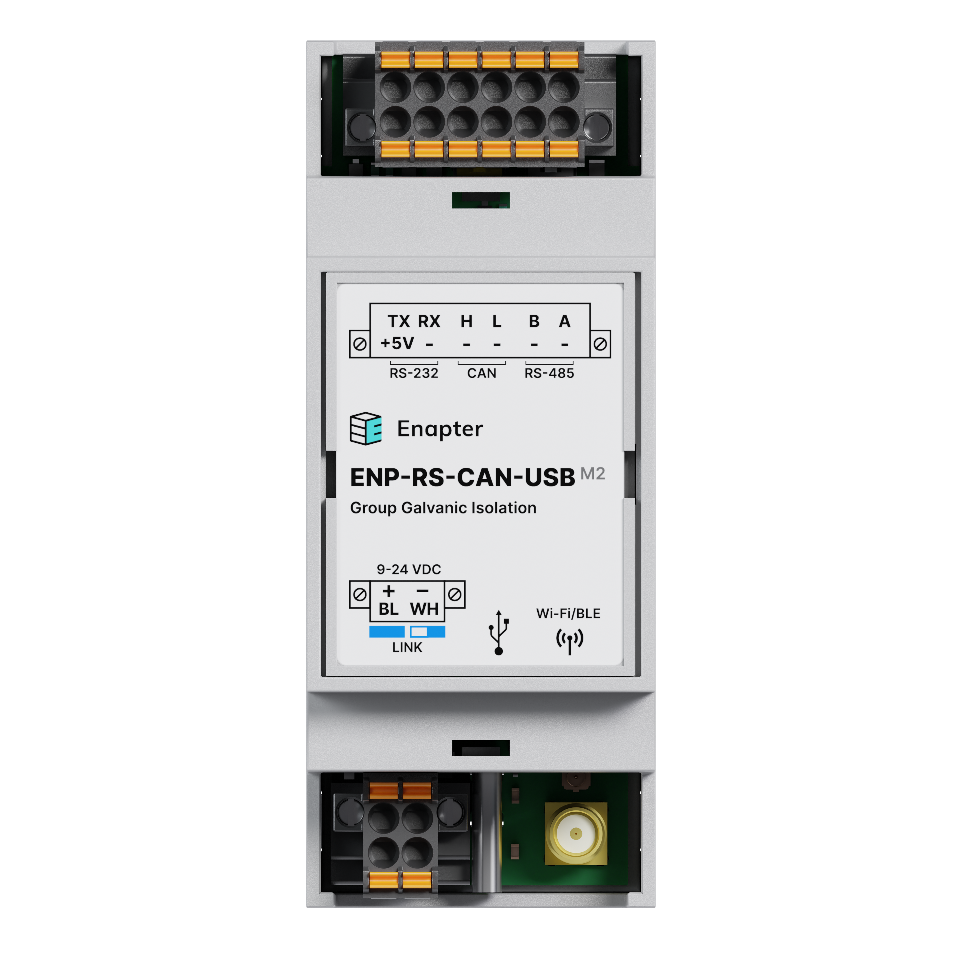 The ENP-RS-CAN-USB M2 module features a wired bus interface based on the Enapter Link protocol, enabling reliable communication with other modules. It also includes wireless Wi-Fi capabilities for secure data transmission and control via the Enapter Gateway and Enapter Cloud. Additionally, the module is equipped with a USB interface for direct connection to the Enapter Gateway.